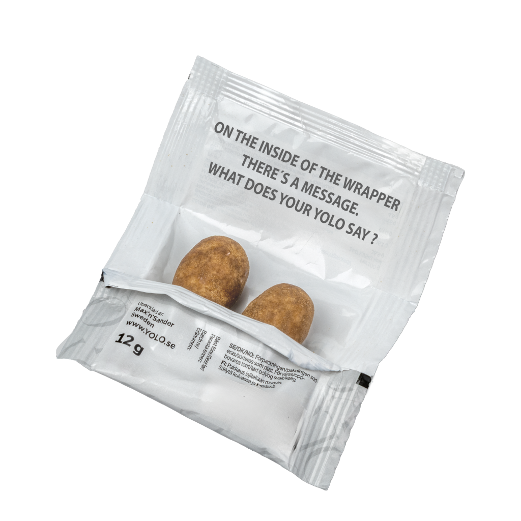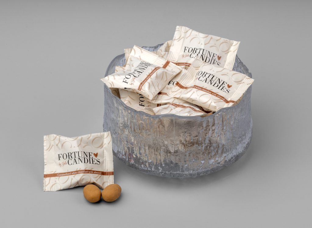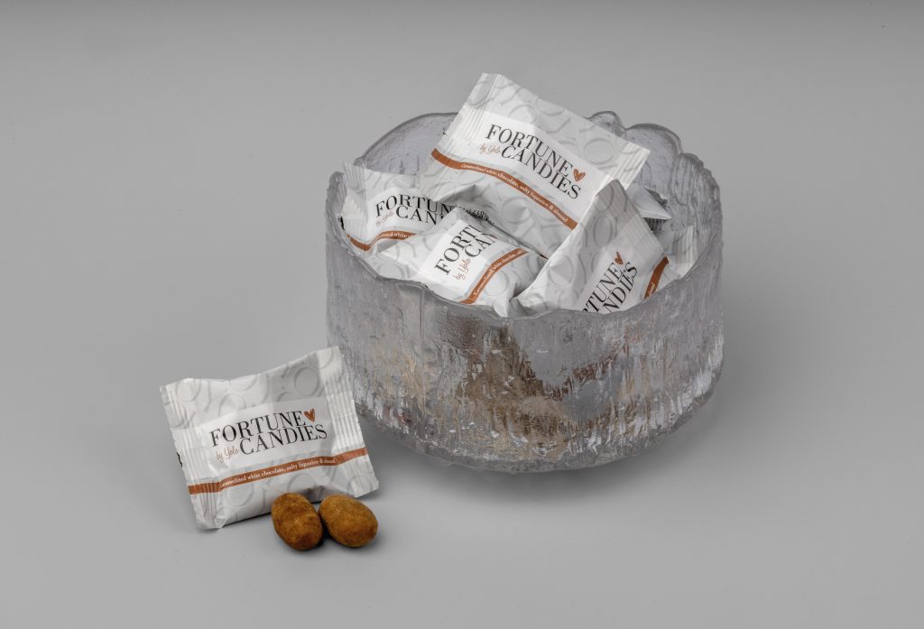 Karamelliserad vit choklad med krossad mandel – en smakresa i varje bit. Denna choklad innehåller en perfekt balans mellan söt karamell och len vit choklad. Med sitt meddelande på insidan av godispappret blir FORTUNE CANDIES en naturlig del av gästupplevelsen.